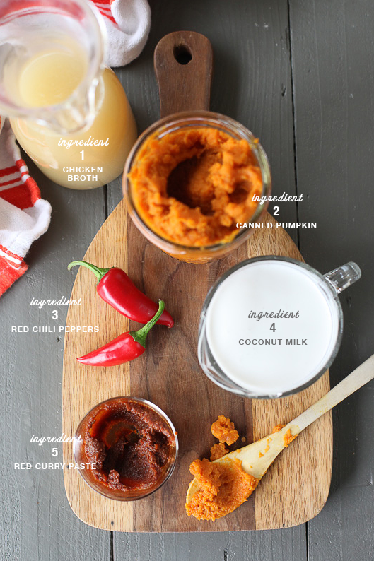 Chicken broth + canned pumpkin + chili pepper + coconut milk + red curry paste. Get the recipe.